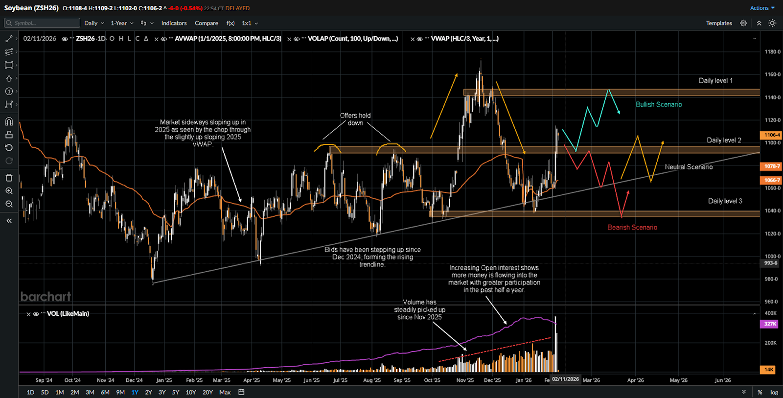 • Responsive sellers entered near 1161 to 1162 as the market transitioned from expectation to realization. December 2025 pressure followed headlines pointing to accelerating Brazilian planting progress, improving South American weather forecasts, and confirmation that Brazil was on pace for a record soybean crop. A firmer US dollar and year end position squaring further weighed on prices, pushing the market back below 1092 to 1095 and down toward 1040, which aligned with the rising trendline and a prior swing low.
