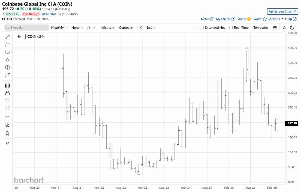 While not perfectly correlated, COIN does track Bitcoin well. The monthly chart shows that COIN shares reached a record high of $444.64 in July 2025. The Trump administration has supported cryptocurrencies, and COIN’s CEO, Brian Armstrong, met privately with President Trump in early March before the President publicly accused banks of trying to undermine the pro-crypto GENIUS Act and urged passage of the Clarity Act in a Truth Social post.