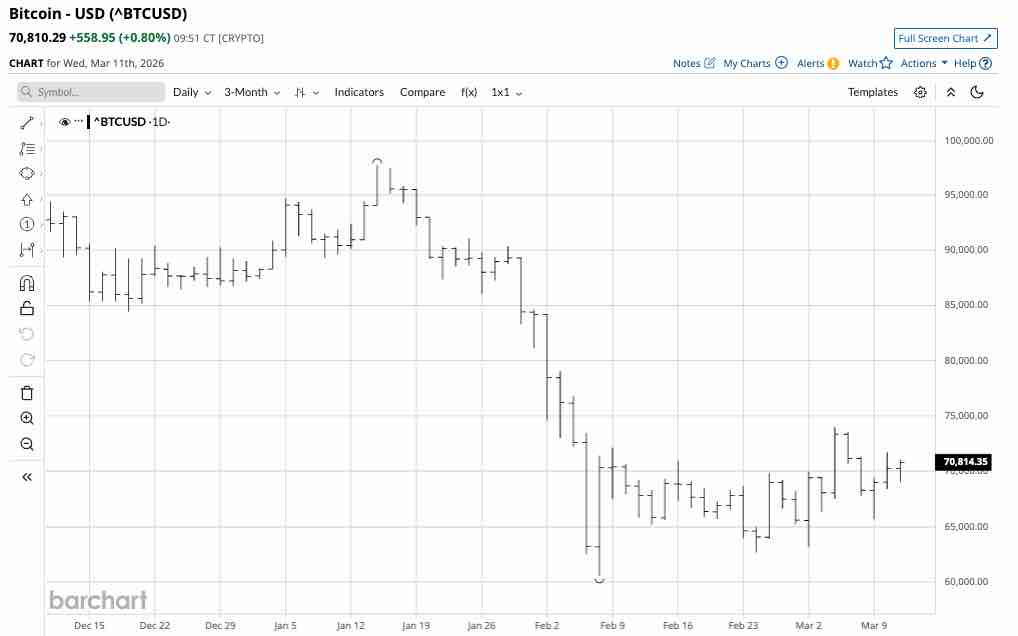 The three-month daily chart shows that Bitcoin has moved into a consolidation period. However, the consolidation has had a bullish bias, with Bitcoin making higher lows since February 6, reaching a high of nearly $74,000 on March 4, 2026.