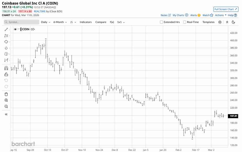 The daily six-month chart shows that COIN shares reached a high of $402.16 on October 10 and fell 65.35% to a $139.36 low on February 12. From the February 6 low to the March 4 high, Bitcoin recovered by 22.3%, while COIN shares move 53.2% higher from $139.36 to $213.50 per share.