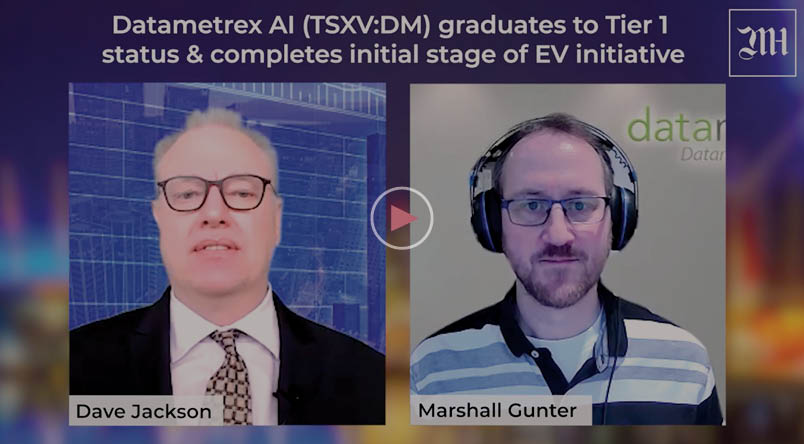 Datametrex has graduated to Tier 1 on the TSXV. Tier 1 is the TSXV's premier tier and is reserved for the TSXV's most advanced issuers. Datametrex has completed the initial development of an app that utilizes its proprietary AI engine to address the growing EV charging market. Marshall Gunter, CEO of Datametrex sat down with Dave Jackson to discuss the news.