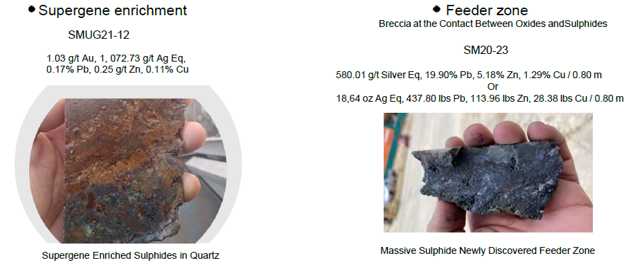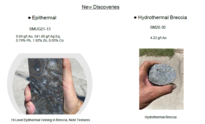 In addition to the numerous mineralized intercepts, new discoveries were made from low sulphidization epithermal type; to hydrothermal type, to super gene enrichment and massive sulphide feeders. See below for examples.