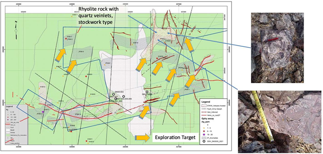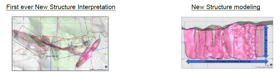 This work led to a new understanding of the Santa Maria property and the relationship of hydrothermal mineralized dioritedikes, and the related mineralized breccias located mostly along the footwall and hanging wall of the dikes. With this understanding it became evident that there were multi pulses of mineralized material in various structures.