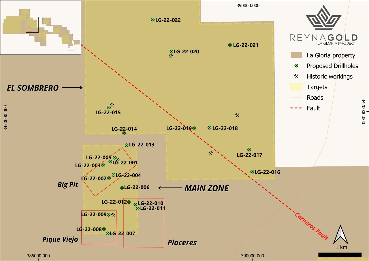 "Following on from our excellent initial surface and trench sampling program we are exciting to start drilling at La Gloria. The initial drilling is focused on the Main Zone and El Sombrero targets, a 2,000 hectares/20 km sq area. The aim of the program is to explore for extensions of known mineralization from the Main Zone into El Sombrero, a part of the property never previously drilled, and gain greater knowledge within the Main Zone of the known mineralization and geological structures." said Michael Wood, CEO of Reyna Gold.