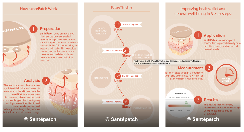 According to santéPatch's founder, Yasar Tunc, "santéPatch uses an advanced biochemical process (called reverse iontophoresis) built into the patch worn on the skin to attract nutrients present in the fluid around skin cells. A spectrometer micro-sensor in the patch non-invasively measures the fluid for nutrients and provides a view of the vitamin and mineral levels present. This data can then be transmitted wirelessly to the cloud for further analysis. The whole process is easy, convenient, pain-free, and real-time (after wearing the patch at least 15 minutes)."