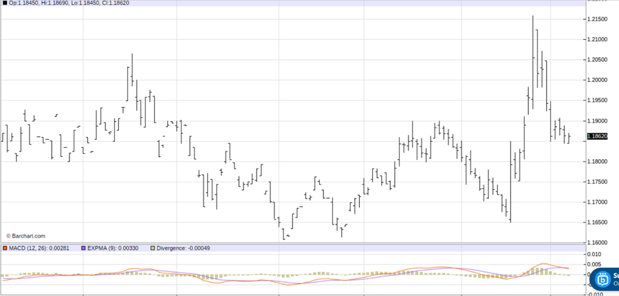 See on the daily bar chart for the June Euro currency futures that prices are starting to trend lower. See, too, at the bottom of the chart that the moving average convergene divergence (MACD) indicator is also in a bearish mode, as the blue MACD line is below the red trigger line and both lines are trending down.