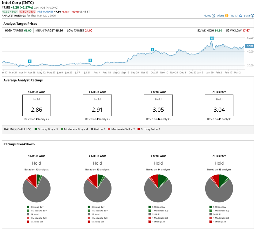 Wall Street analysts currently maintain a consensus “Hold” rating on Intel shares. Notably, the stock is already trading in line with the average analyst price target. Moreover, the highest price target for INTC stock is $66 per share, representing roughly 38% upside from its recent closing price.