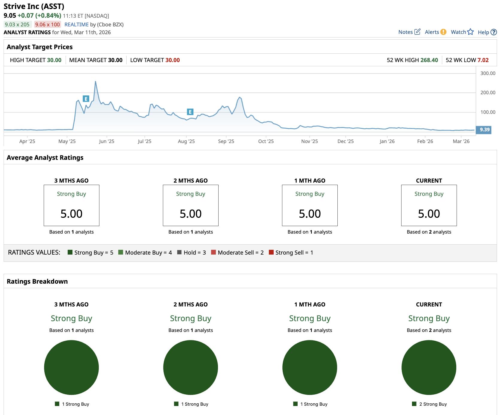 B. Riley Securities initiated coverage of Strive (ASST) with a “Buy” rating and a $12 price target on March 11. With shares trading around $9.32 that afternoon, the target implies roughly 30% upside.