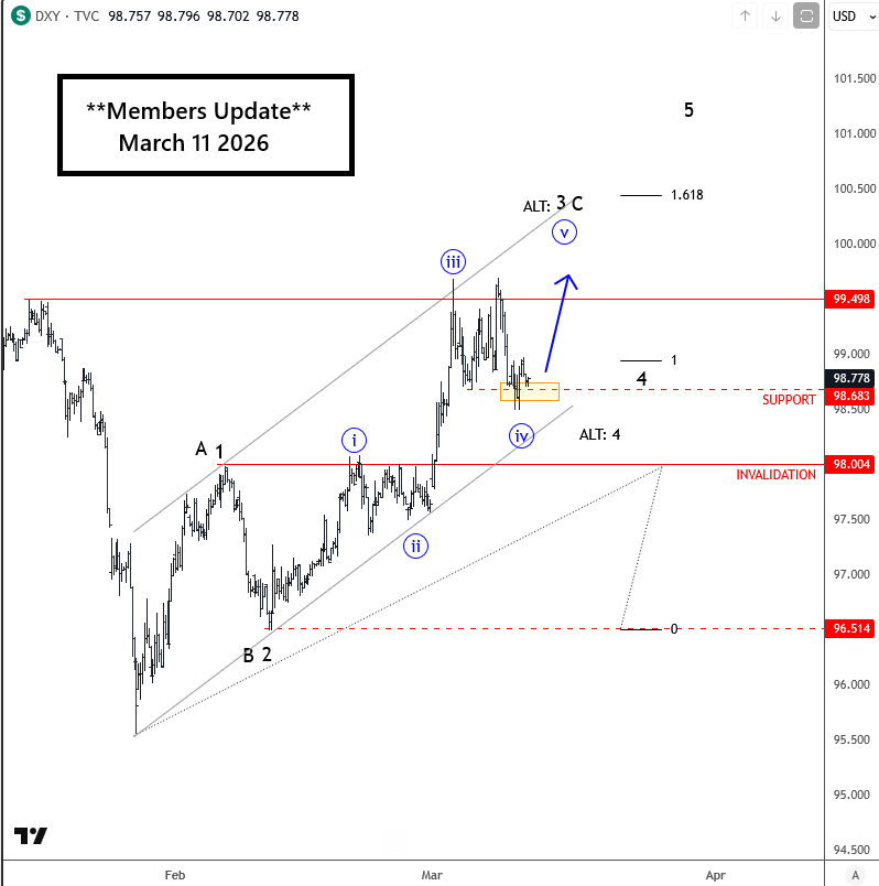 “Middle East tensions continue to escalate, pushing crude oil sharply higher with prices gapping more than 20%, which is adding pressure on stocks and keeping markets in a risk-off mood. At the same time, the US dollar has strengthened as investors seek safety. While gaps often get filled and the dollar may still be trading within a fourth-wave consolidation that could take the form of a triangle or flat, the broader outlook suggests a potential pause followed by another push higher into wave five. Key support for the dollar index is seen around the 98.85–98.66 area, where buyers may step in as geopolitical uncertainty, inflation concerns, and recession risks continue to support demand for the USD.”