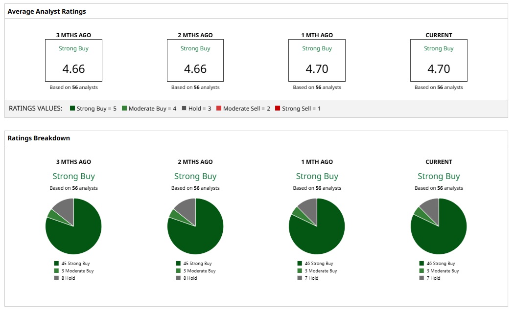 Based on 56 analysts with coverage, META stock is a consensus “Strong Buy.” While 46 analysts assign a “Strong Buy” rating, three analysts have a “Moderate Buy" rating, and seven analysts call META a “Hold.”