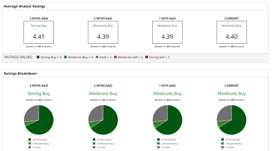Overall, analysts are positive, with a “Strong Buy” consensus with 30 “Strong Buy” and three “Moderate Buy” ratings versus 12 “Hold” ratings and a 12-month average price target around $288, roughly 50% above current levels.
