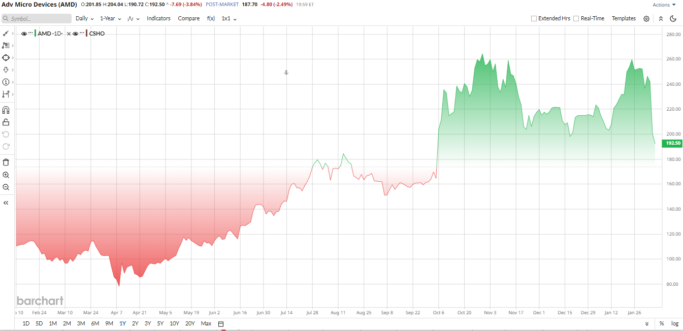 That optimism showed up clearly in AMD’s share price last year. AMD stock surged sharply in 2025, ending the year up roughly 75% over the past 52 weeks. This outperformance came on booming AI and cloud forecasts; investors bid up AMD on its new data center chips and partnerships. However, in early 2026, the stock has pulled back on profit-taking and broader tech volatility.