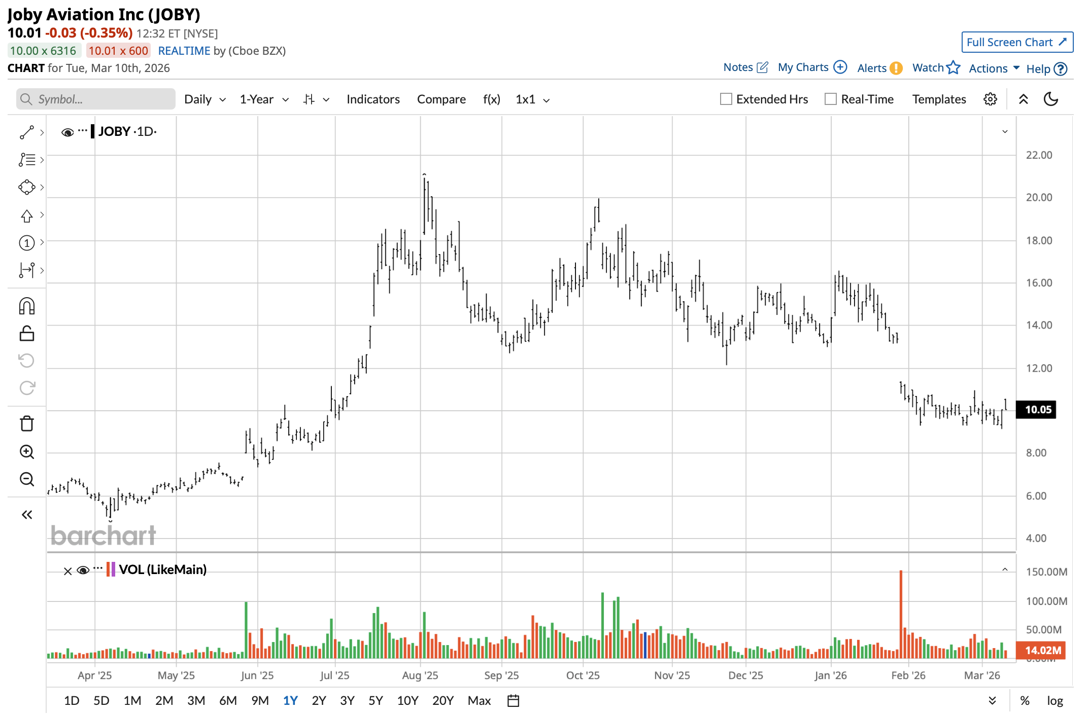 JOBY stock has fluctuated significantly, reflecting both the enthusiasm and uncertainty surrounding this new eVTOL industry segment. JOBY stock has ranged between $4.96 and $20.95 in the past 52 weeks, most recently trading near $10 per share. While the stock has gained slightly in recent weeks — up 1.3% in the past five days — JOBY is still well off the highs seen just a year ago, reflecting the cautious attitude investors are taking toward this early-stage aviation technology.
