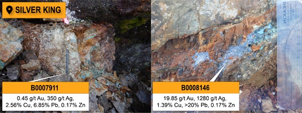 The Silver King prospect consists of an approximately 20 meter wide intermediate Lower Hazelton lapilli tuff bed hosting replacement-style hydrothermal copper-silver-gold mineralization, along with polymetallic gold-silver-zinc-copper vein-hosted mineralization. Samples from the Silver King prospect returned up to 19.85 g/t Au, 1280 g/t Ag, and 2.56% Cu (see Figure 5). Highlights of the 2021 sampling at Silver King include: