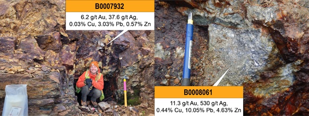 B0008061: 11.3 g/t Au, 530 g/t Ag, 0.44% Cu, 10.05% Pb, 4.63% Zn.