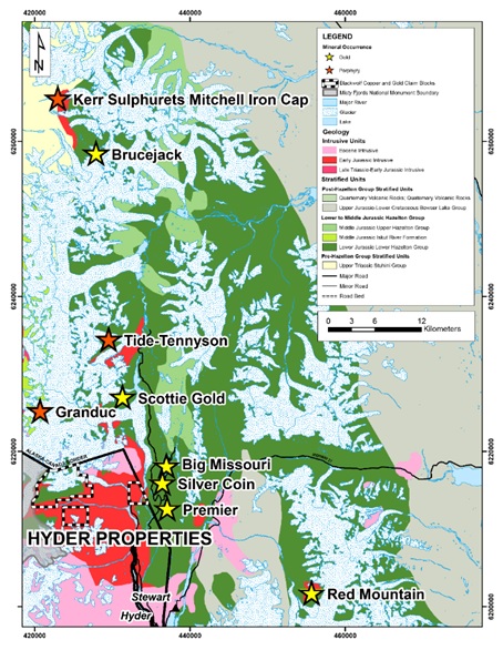 FIGURE 6: Hyder area property locations with regional geology, mines and major deposits in the Golden Triangle.