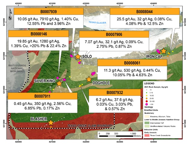 The Solo prospect is located on the western flank of the Texas Creek property and is dominated by quartz-vein hosted massive galena-pyrite-electrum mineralization in Lower Jurassic Lower Hazelton argillitic sediments. In the 1930's, miners built 1,800 meters of tunnels through an ice sheet chasing source of the electrum, including a glacial transported float that assayed over 20,000 g/t Au. Significant glacial recession has occurred since, however large areas of snowpack did not melt during the summer of 2021, including the estimated location of one of these high-grade veins in outcrop. Intrusive rocks and very high-grade late tension veins are similar to the Premier and Brucejack deposits in the Golden Triangle and suggest potential for a strong mineralizing system. 2021 samples at the Solo prospect returned up to 10.05 g/t Au, 7,910 g/t Ag, 12.55% Pb and 3.96% Zn in one of these veins. Highlights of the 2021 sampling at Solo include: