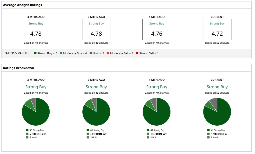 Based on 50 analysts with coverage, MSFT stock is a consensus “Strong Buy.” While 41 analysts assign a “Strong Buy” rating, four analysts have a “Moderate Buy” rating, and five analysts have a “Hold” rating.