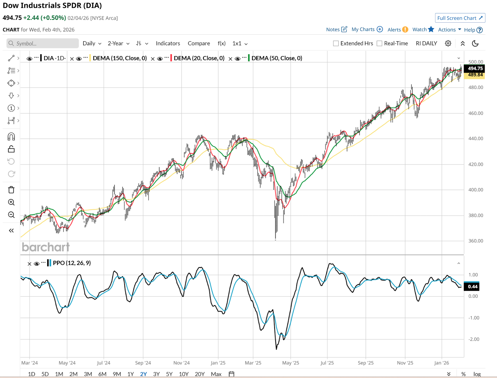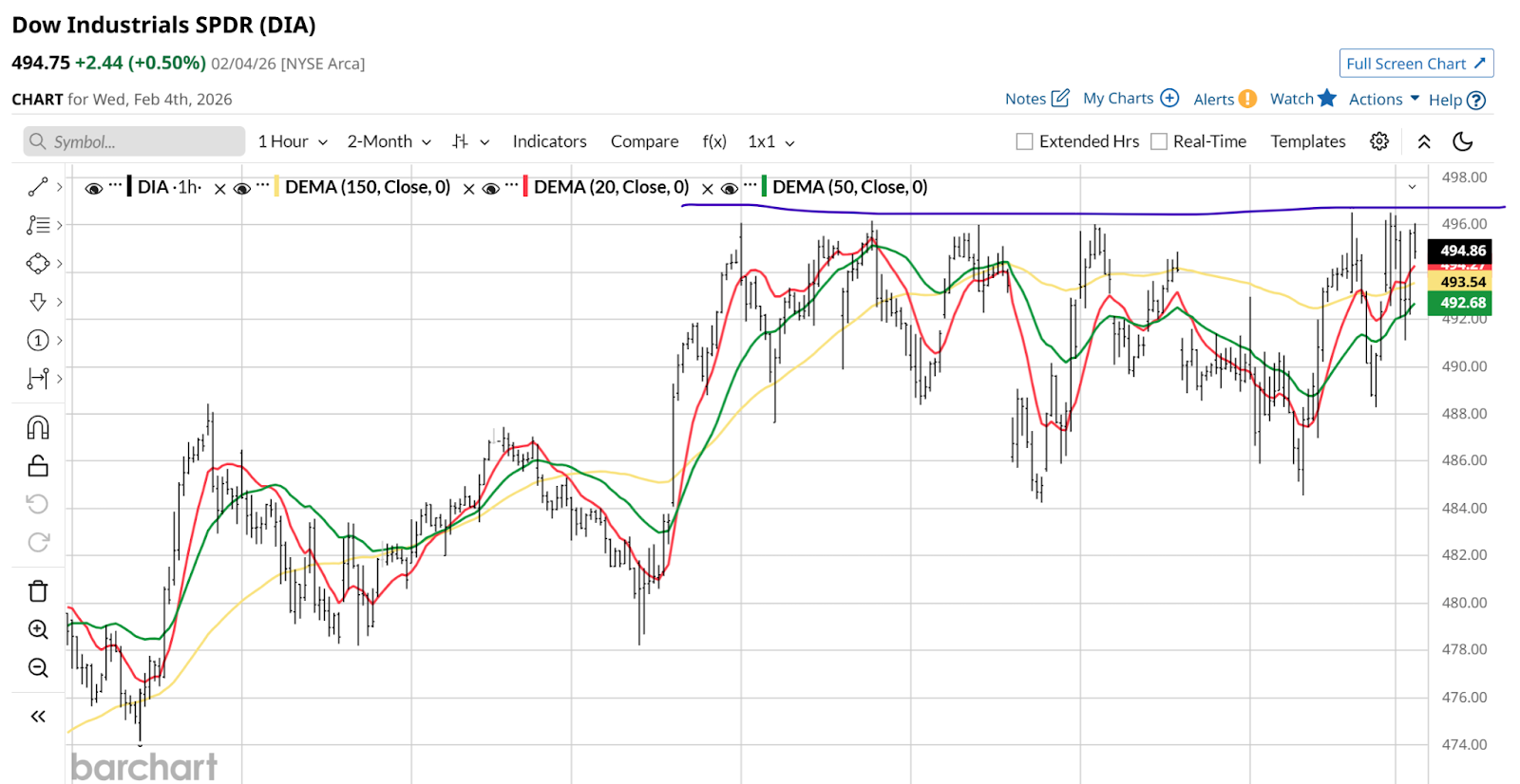 There’s a lot of “no” votes appearing once the Dow approaches that 50,000 level, which is roughly $500 a share in DIA terms. Still, it is just a few hundred points away.