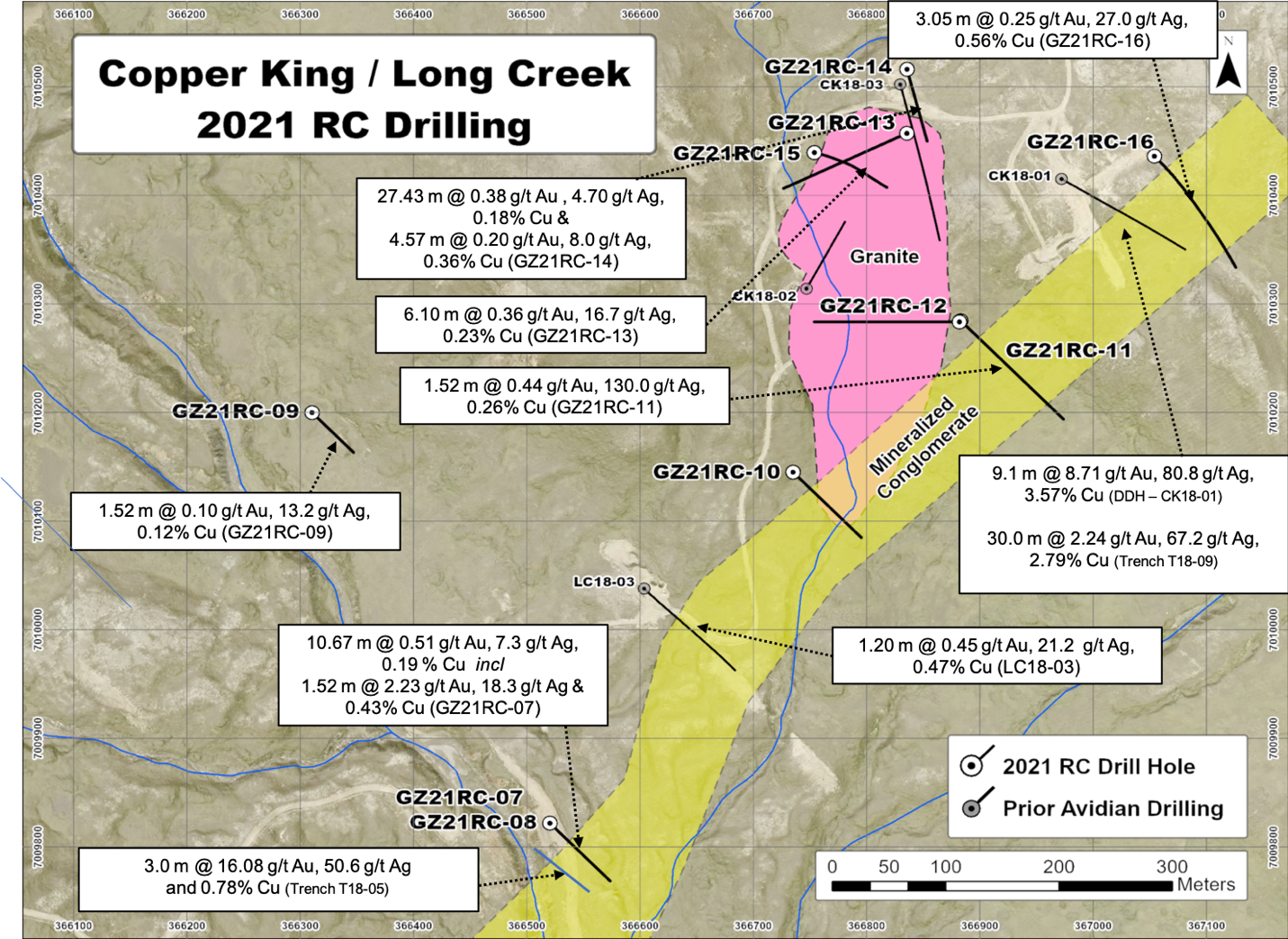 Drilling in the Copper King/Long Creek area in 2021 focused on two main targets. The first is replacement mineralization within a conglomerate horizon (Style i as above) that is intermittently exposed over a strike length of 2 km as this conglomerate is known to contain significant mineralization locally as noted above. The drilling program only tested the northeastern portion of the conglomerate horizon (5 holes) over a strike length of approximately 1 km at a minimum 200 m spacing (see Figure 3) with significantly anomalous Cu, Ag, and Au noted in 4 of 5 holes such as 10.67 m @ 0.51 g/t Au, 7.3 g/t Ag and 0.19 % Cu including 1.52 m @ 2.23 g/t Au, 18.3 g/t Ag and 0.43% Cu in hole GZ21RC-07. The second target is mineralization more clearly related to the quartz-eye porphyry granite (Styles ii to iv as above) in the vicinity of a CSAMT Impedance anomaly. Hole GZ21RC-13 encountered 6.1 m @ 0.36 g/t Au, 16.7 g/t Ag and 0.23% Cu , and 4.57 m @ 0.81 g/t Au including 1.53 m @ 1.68 g/t Au ( Figure 3). The granite was also found to be much more extensive than previously known, and the distribution of molybdenite is also more widespread.