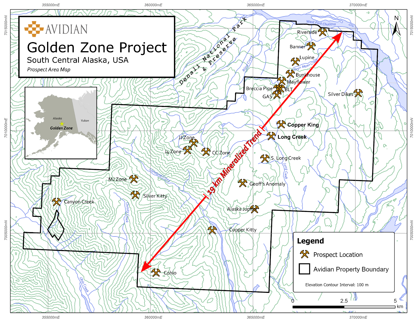 TORONTO, ON / ACCESSWIRE / February 28, 2022 / Avidian Gold Corp. (" Avidian " or the " Company ") (TSXV:AVG.VN)(OTC-BB:AVGDF) is pleased to provide an update from the Copper King/Long Creek 2021 reverse-circulation ("RC") drilling program at its district-scale (125.5 sq. km) Glden Zone Project (Figure 1) strategically located in south-central Alaska midway between Anchorage and Fairbanks only 10 km west of paved State Highway 3, the Alaska Railroad and the 345 kV Alaska Intertie power lines.