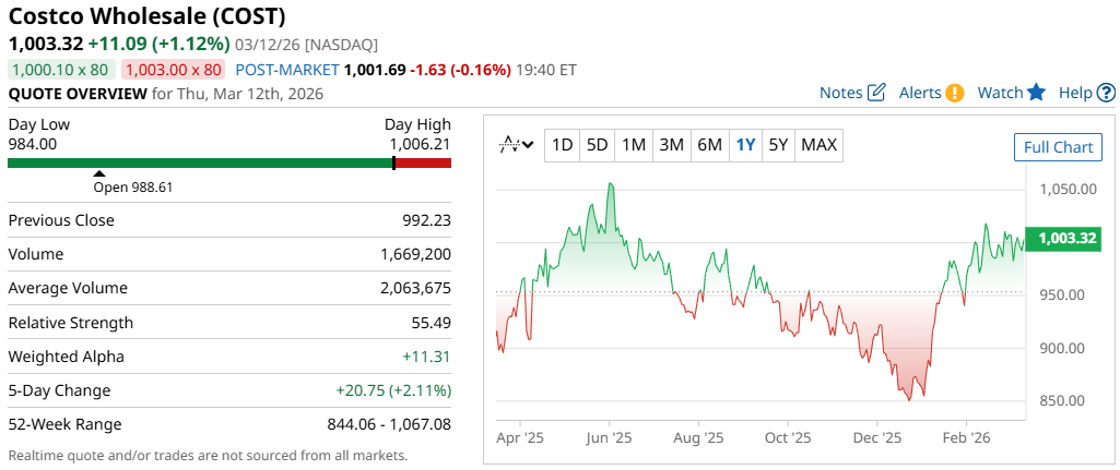 Right now, the COST stock is trading around $1,003 per share, which is up 16% year-to-date.