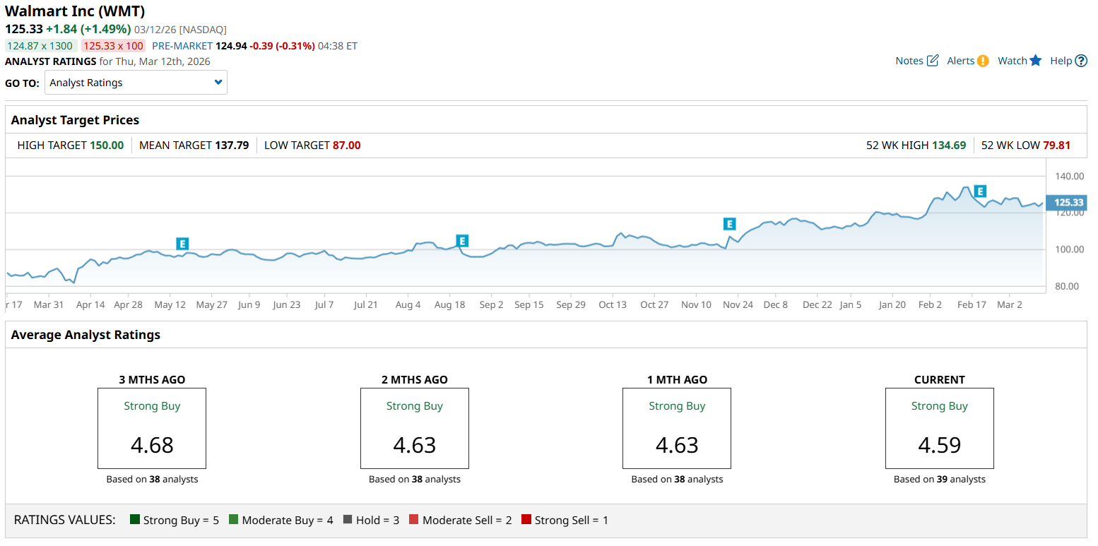 A consensus among 39 analysts rates Walmart stock a “Strong Buy”. The stock also has as much as 20% upside potential if it reaches its high target of $150.