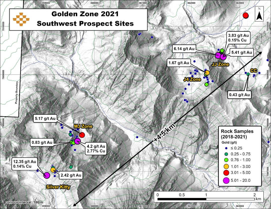 Avidian's Southwest Prospects collectively consist of at least 5 large gossanous gold-bearing zones (JJ, J4, CC, MJ, and Silver Kitty), all within the same stratigraphic sedimentary rock package defined along a NE-SW direction over a strike length of +4.5 km in the southwestern portion of the 19 km mineralized trend that extends across the entire Golden Zone property (Figures 1 & 3). Each of the prospects has only been sparsely sampled due to challenging topography and has yet to be fully assessed or sampled in-between each of the currently known prospect areas. The newly staked ground has also yet to be explored.