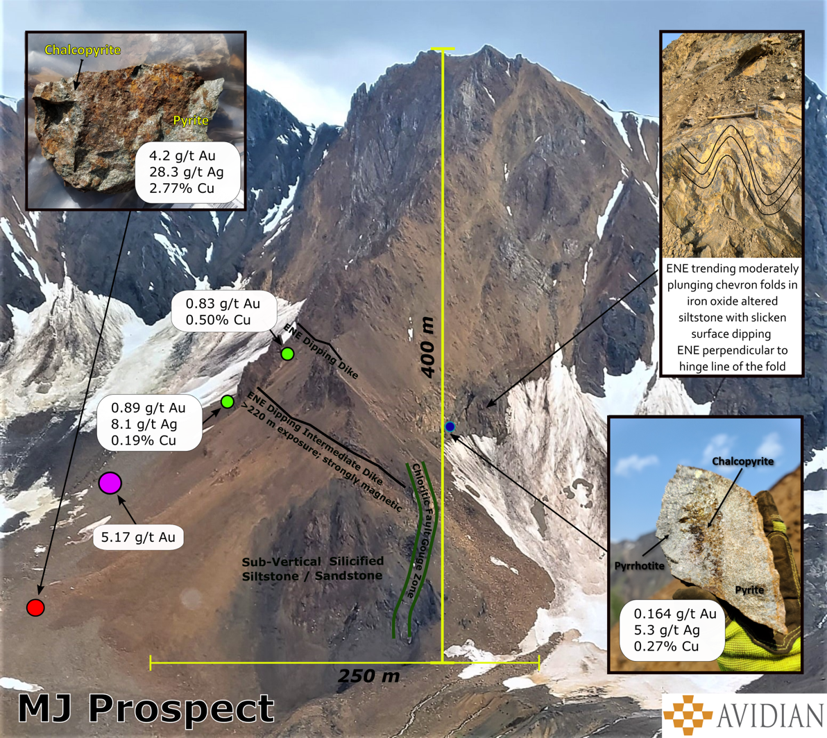 - The MJ prospect located approximately 2,750 m to the southwest of the J4 prospect returned highlight results of 0.83 g/t Au, 5.17 g/t Au and 4.2 g/t Au plus 2.77% Cu from a sulfide-rich gossan zone 800 m x 300 m x 100 m and open along strike in both directions (see Photo 2).