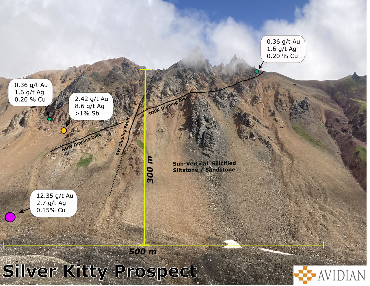 - Prospecting at the Silver Kitty area (approximately 850 m to the southwest of MJ) yielded an assay result of 12.35 g/t Au and additional sampling during 2021 returned grab samples up to 2.42 g/t Au and 8.6 g/t Ag (see Photo 3) The Silver Kitty prospect to date has been outlined over a 500 m wide by 300 m high gossanous slope that trends northwest-southeast and is perpendicular to the MJ prospect. Approximately 5 km to the south is the Cohio prospect (see Figure 1) where historical grab sample grades of 111.0 g/t Au, 15.0 g/t Au and 9.7 g/t Au have been reported.