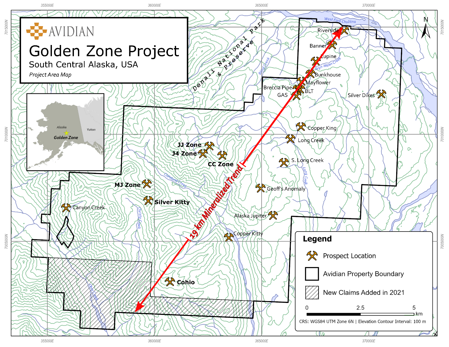 TORONTO, ON / ACCESSWIRE / March 7, 2022 / Avidian Gold Corp., ("Avidian" or the "Company") (TSX-V:AVG & OTCQB:AVGDF) is pleased to announce that it has staked an additional 1,683.5 hectares (16.835 sq km) of ground immediately to the south and southwest of its Golden Zone property to increase its district-scale land holdings to 141.1 sq. km(see Figure 1). The Golden Zone property is strategically located midway between Anchorage and Fairbanks and only 10 km west of paved State Highway 3, the Alaska Railroad, and the 345 kV Alaska power lines.