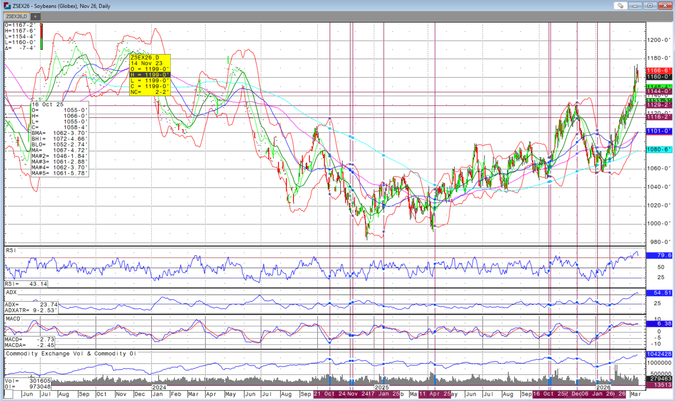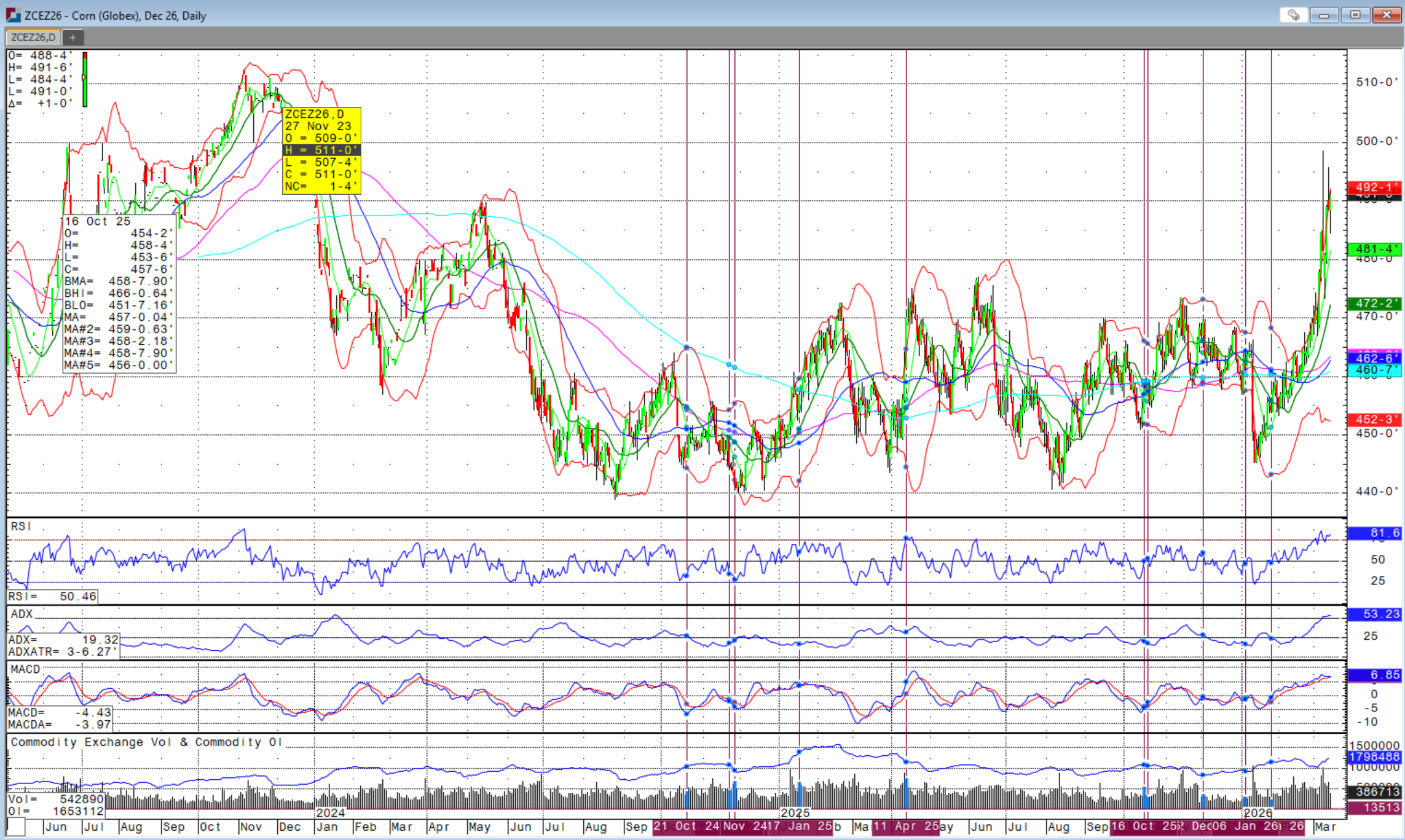Corn futures rallied with the new crop December 2026 contract reaching $4.98 ½ on Monday’s high and closing just off that high at $4.91 ¾ after the strong recovery on Friday. I think it’s a possibility that we see above $5.00 new crop corn futures this next week, depending on the Middle East situation. The all-important USDA March Planting Intentions report is coming up on March 31st.