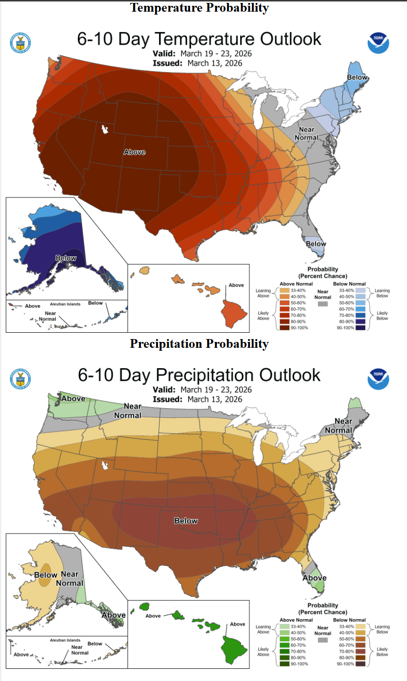 The corn market benefited from higher crude, which supported wheat. However, the wheat market alone has the drivers of conflict demand on its side as well as a freeze for the Southern Plains wheat areas on Sunday and Monday. While it is only mid-March, the heat and some recent moisture have accelerated growth out of dormancy in recent weeks, making the impact of freeze more concerning. On top of that, the drought situation across Oklahoma and Texas continues to spread with a dry and hot forecast ahead with highs in the 90s by late next week. These fundamental factors combined with an unpredictable oil market could lead to some meaningful upward price action next week.