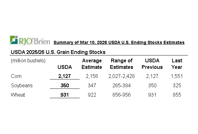 Global corn ending stocks increased above last month and expectations. Global soybean ending stocks decreased slightly from last month, but not as much as expected. Global wheat ending stocks declined more than unchanged expectations. The Australia wheat crop was lowered while Argentine wheat exports increased. EU, Russia and Ukraine wheat exports were lowered while Ukraine's wheat crop increased.