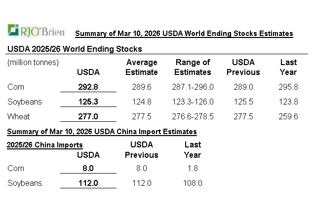 USDA’s monthly Crop Production and WASDE reports were released on Tuesday. US corn ending stocks were lower than expected, but unchanged from last month. Ending stocks were higher than expected for soybeans and wheat, but also unchanged from last month. The Brazil soybean crop was unchanged at 180.0 MMT while a slight decrease was expected. Brazil’s corn crop increased slightly above last month, but less than expected. Argentine corn and soybean crops declined less than last month and were also lower than expectations.