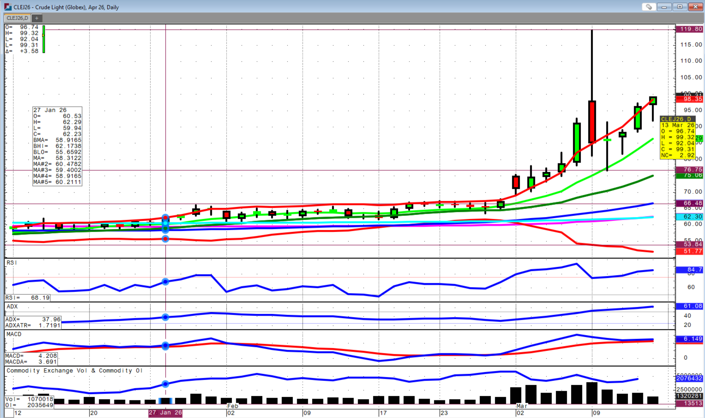 It has been a busy week in the markets, to say the least. It has also been a historic week. If being at war with Iran wasn’t enough, Sunday night’s spike in crude oil markets was the largest in the history of crude oil trading! April WTI futures traded to a high at $119.48 per barrel before collapsing under its own weight to trade to a low of $81.19 in the same session, a daily range of $38.29 per barrel, before closing at $85.08. And that all happened during Monday’s session that started on Sunday at 5 PM CDT.