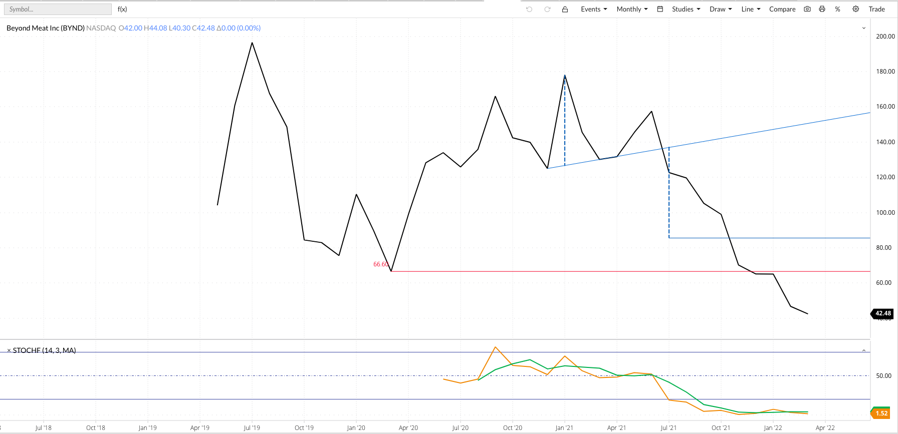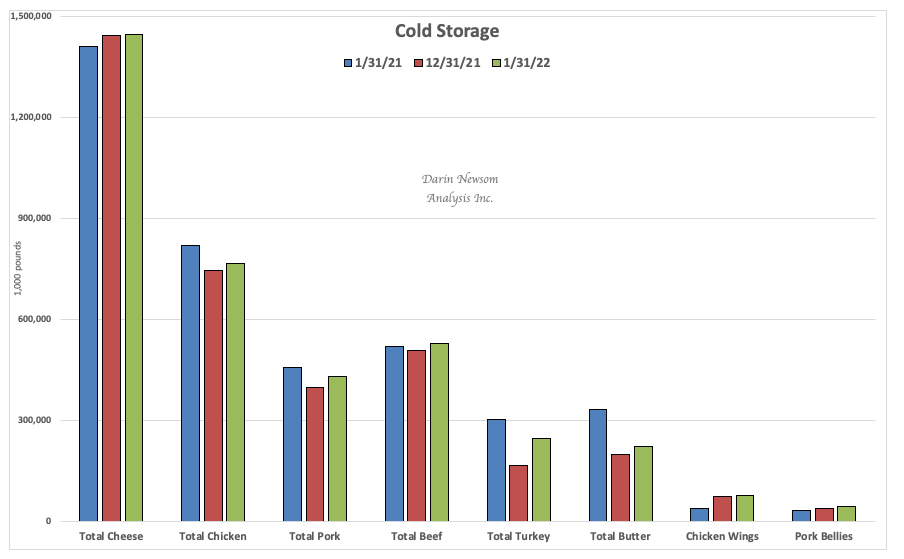 Yes. I think the higher cuts of meat will be trimmed from the budget. Where might the dollars go instead? Will folks be buying impossible burgers and other imitation meat products? Well, if the stock price of Beyond Meat (BYND) is any indication, my answer is still “no”. It’s interesting to go back to my piece from late October 2021 and look at what BYND has done, overshooting my downside target on its monthly chart. This says market fundamentals are more bearish than earlier projected. On the other hand, talking to a chicken processor on the East Coast, one of the largest in the industry, I’ve learned they can’t kill chickens fast enough to meet demand. This tells us discretionary dollars in the US are going toward cheaper proteins, less expensive cuts of meat like real hamburger and chicken. We can also see signs of this in the latest Cold Storage report from USDA, as of February 1, 2022. On the beef side, despite a 5% decrease in marketings during January frozen stocks increased by 4% from the previous month and 1% from the previous year.