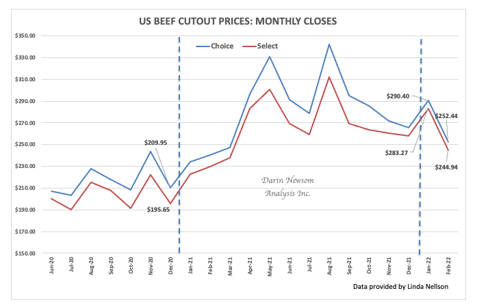 One of the markets that jumped out at me early Wednesday morning was beef cutouts. Tuesday afternoon reportedly saw choice come in at $252.44, down $2.27 from Monday while select was quoted at $244.94, $5.28 lower than the previous day. Those are some solid hits, not only adding to the break seen since the end of August highs of $342.11 and $312.03 respectively but dropping to levels not seen in nearly a year. The last time the cutout markets were this low was back on April 1, 2021 – no fooling. During February alone both cutout markets lost roughly $38 from the end of January.