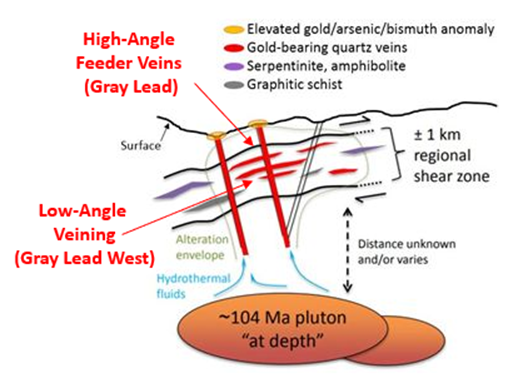 - Consistent with the Pogo Geological Model, Gray Lead West is interpreted to connect to the immediately adjacent Gray Lead vein, an interpreted high-angle feeder zone. Gray Lead exhibits 250m of mineralized strike, is drill tested to only 120m vertical, and open in all directions