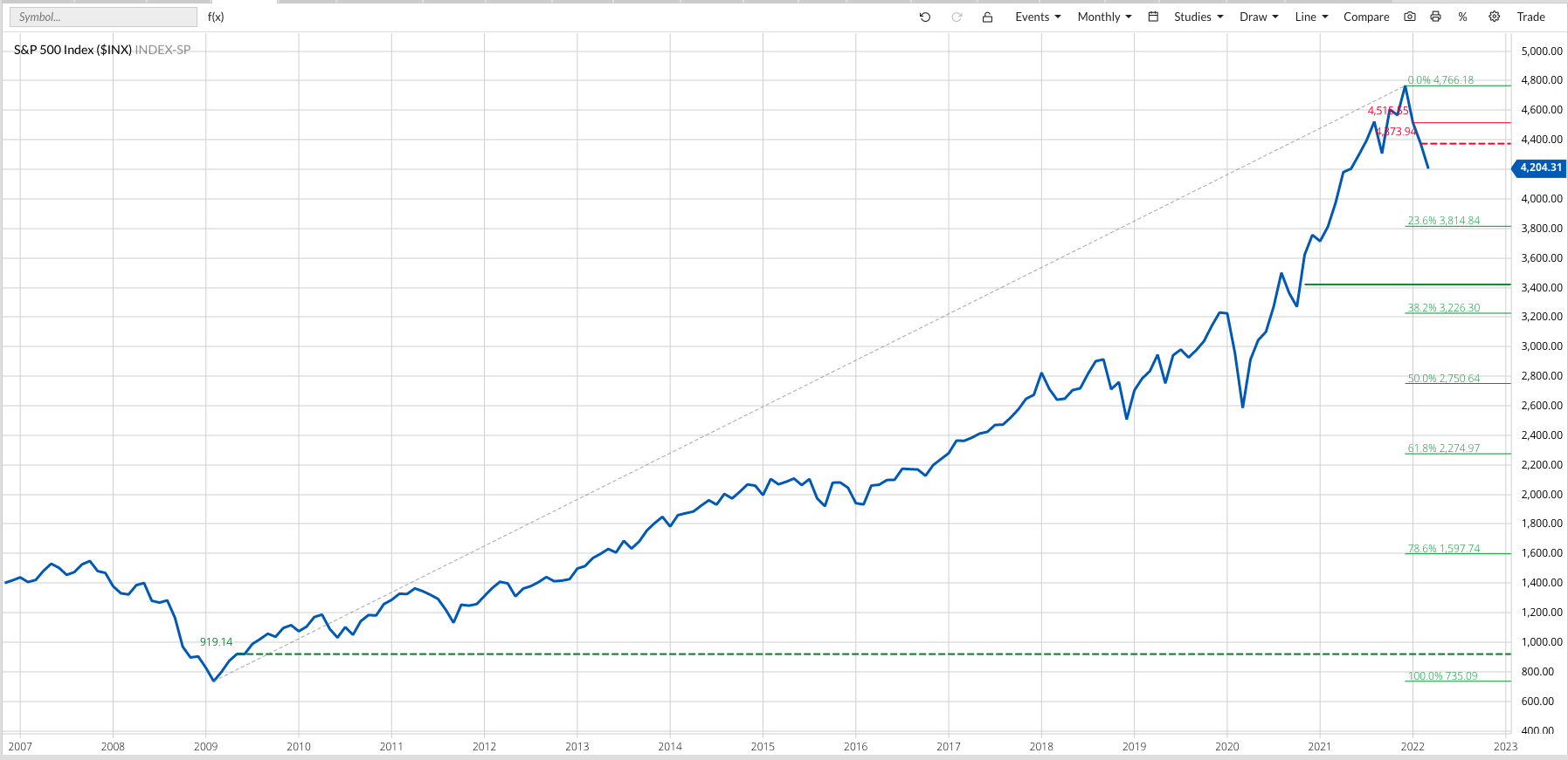 ‘Recession’ is defined as “A moderate and temporary decline in economic activity.” Since that meeting, I’ve heard a lot of chatter about double-digit interest rate increases (times, not the actual interest rates) by the US Federal Reserve and a coming recession. If we apply Dow Theory, looking at monthly closes only, and the 4-Month Rule (my interpretation of the Four-Week Rule), then a major downtrend was confirmed by the February close of the S&P 500 taking out its previous 4-month low monthly close of 4,373.94. This ended the previous uptrend that began with a new 4-month high monthly close of 919.14 at the end of May 2009. Therefore, the S&P seems destined for continued pressure, with a 33% retracement target (based on monthly closes only) down near 3,422.00.