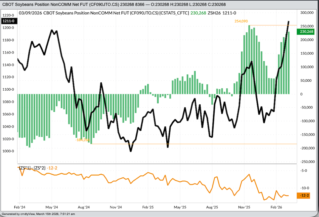 Soybeans: Due in part to spillover buying from soybean oil as Watson looks for a bigger market, noncommercial traders held a net-long futures position of 230,268 contracts, an increase of 8,366 contracts as of Tuesday, March 10. It’s interesting to note the net-long position again came up short of last fall’s peak number of 254,090 contracts.