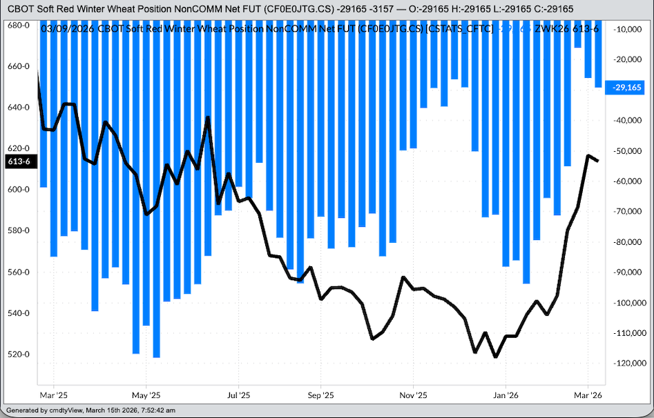 SRW Wheat: Here we see Watson being stubborn given the latest report showed net-long futures positions in both HRW and HRS wheat markets. As for SRW, noncommercial traders held a net-short futures position of 29,165 contracts, an increase of 3,157 contracts as of Tuesday, March 10.