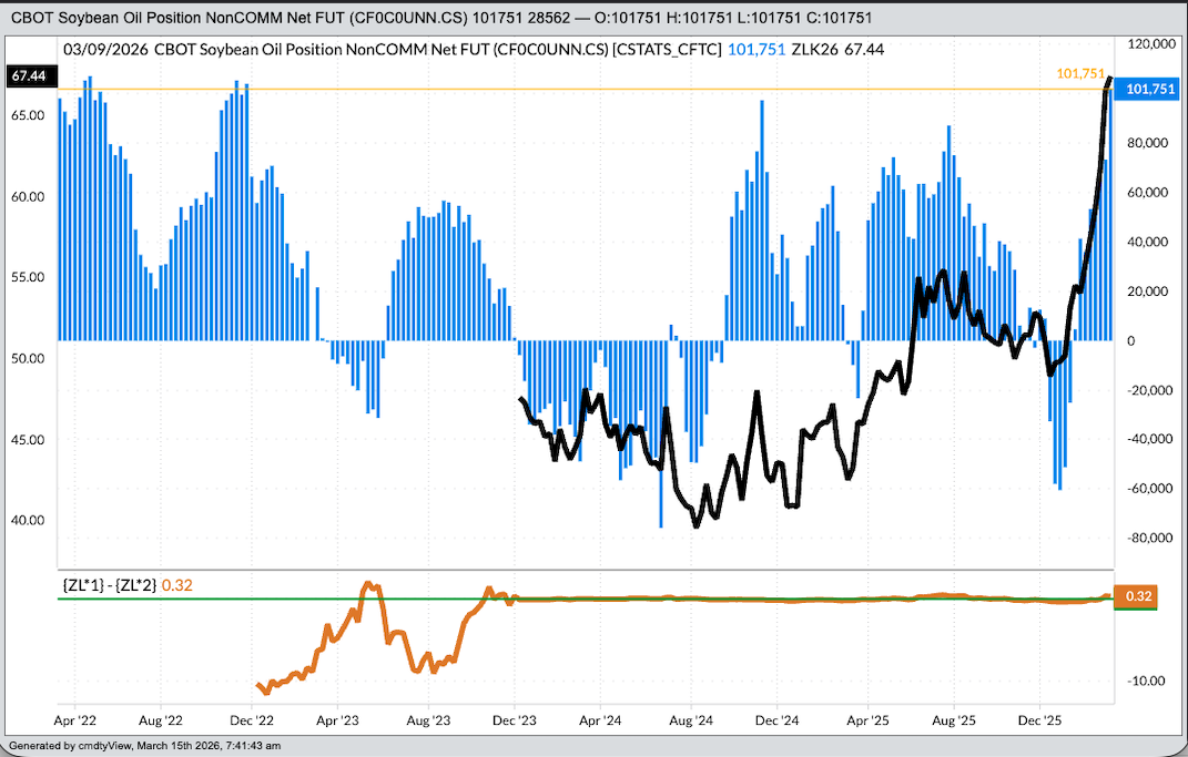 Soybean Oil: Noncommercial traders held a net-long futures position of 101,751 contracts, an increase of 28,562 contracts as of Tuesday, March 10, the largest noncommercial net-long futures position since 103,854 contracts on Tuesday, November 29, 2022.