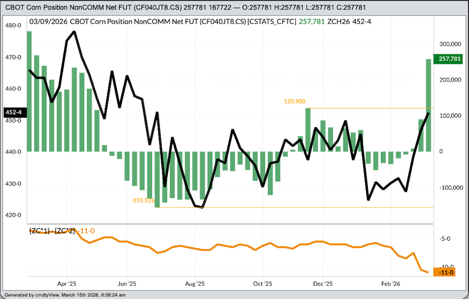 Corn: The King of the Grains sector had a big(ly?) week. The latest Commitments of Traders report showed noncommercial traders held a net-long futures position of 257,781 contracts, an increase of 167,722 contracts as of Tuesday, March 10.