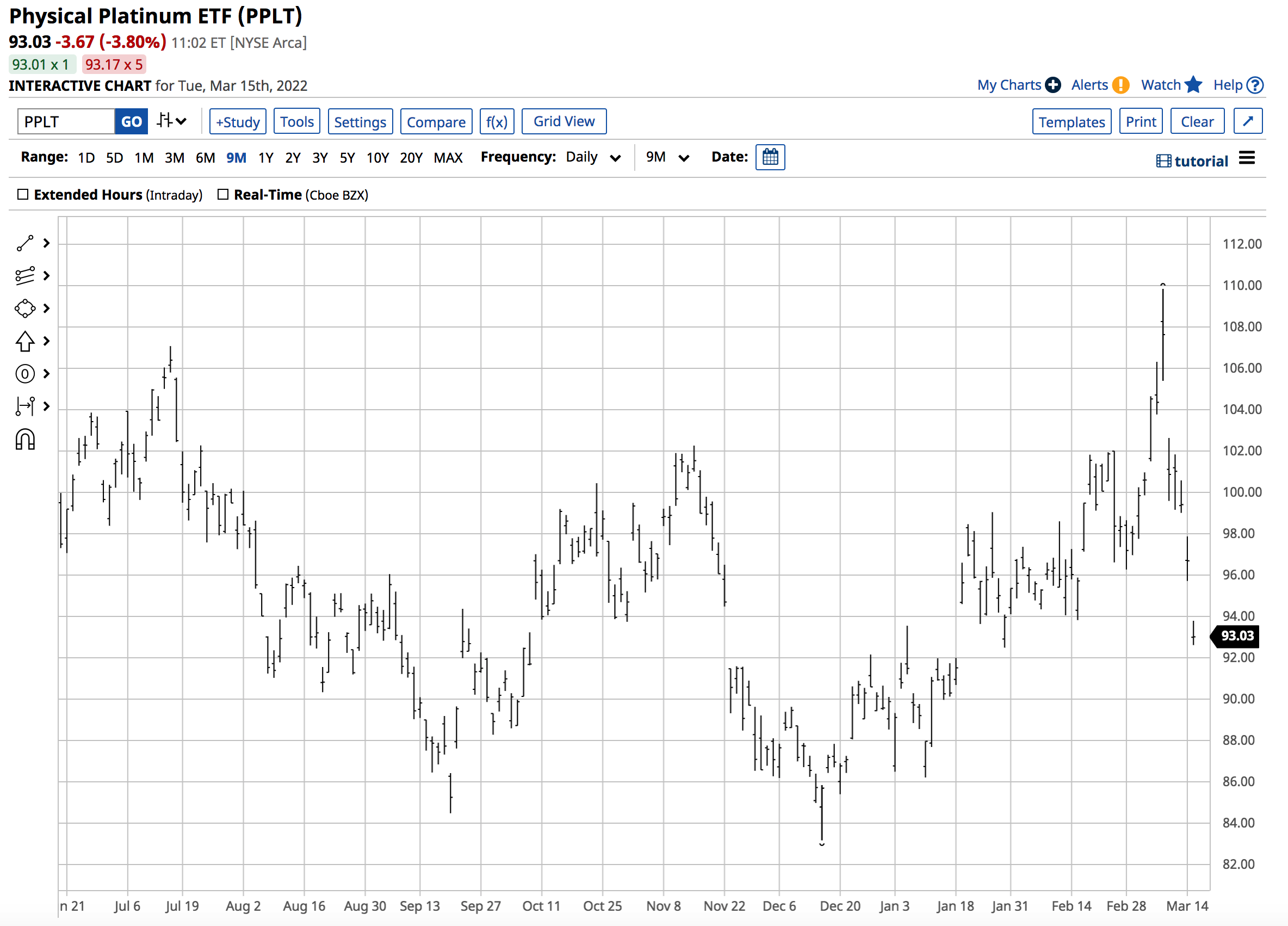 Over the same period, PPLT rose from $83.20 to $109.85 per share or 32.03%. The slightly lower gain was because of the management fee and timing. The ETF only trades during hours when the US stock market operates, while platinum trades around the clock during the business week and often makes highs or lows during European hours.Â