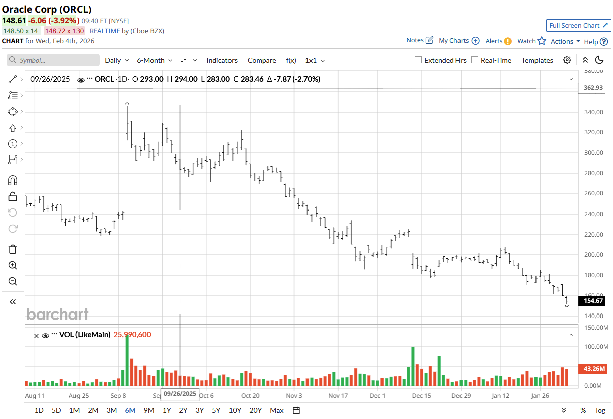 ORCL was comfortably outperforming the S&P 500 ($SPX) last year when it touched highs of nearly $350. Since then, it has more than halved, and over the last 12 months, has returned -11.7% versus the S&P 500’s 14.32%. The stock has become an example of how an AI trade can go bad. At one point, it was among the top 10 companies in the U.S. by market cap.