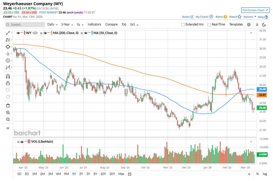 To confirm the bearish trend, WY has been trading below its 50-day and 200-day moving averages since late February.