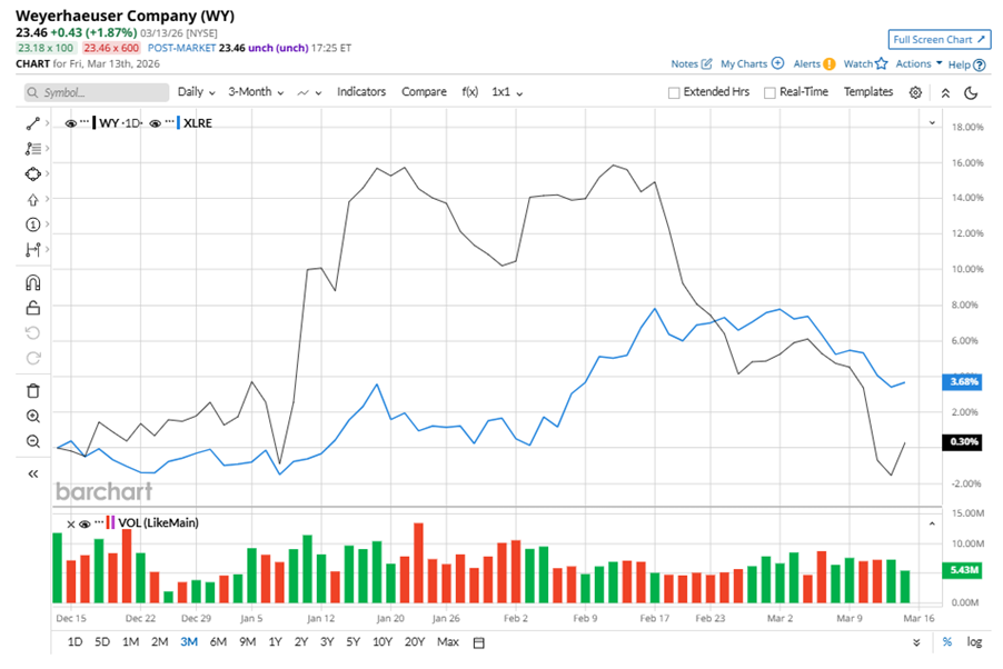 Despite its notable strength, WY slipped 22.5% from its 52-week high of $30.28, achieved on Mar. 17, 2025. Over the past three months, WY stock has gained marginally, underperforming the State Street Real Estate Select Sector SPDR ETF’s (XLRE) 3.7% gains during the same time frame.