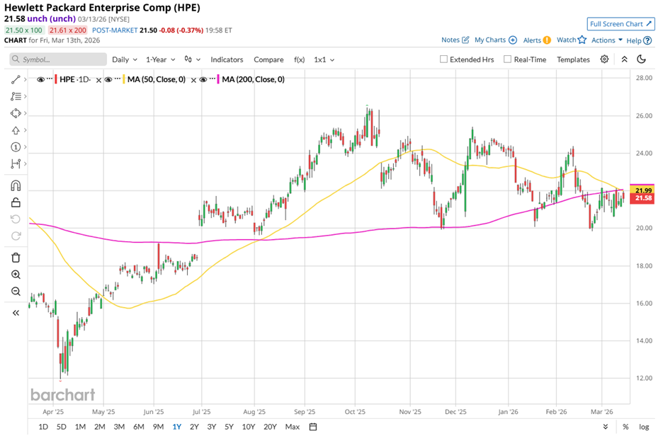 Fundamentals, however, continue to lend support beneath the surface. On March 9, HPE stock rose 3.2% after the company released its fiscal 2026 first-quarter results. Revenue climbed 18.4% year over year to $9.3 billion, matching analysts’ expectations. Non-GAAP earnings grew 32.7% from the year-ago value to $0.65, ahead of the Street forecast of $0.58.