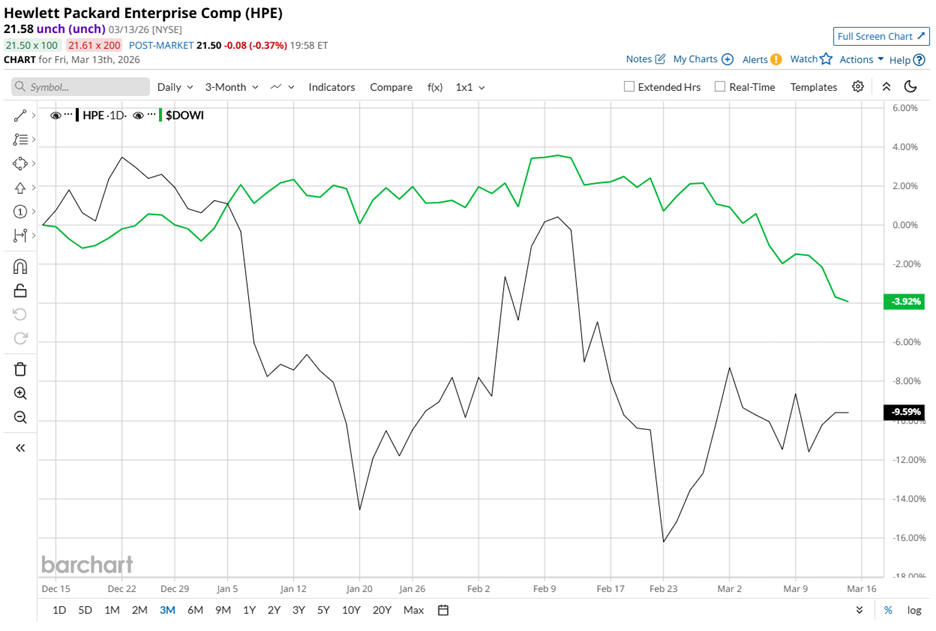 HPE stock currently trades 18.4% below its 52-week high of $26.44 reached in October 2025. Over the past three months, the shares have fallen 9.6%. Over the same stretch, the Dow Jones Industrial Average ($DOWI) has declined a milder 3.9%.